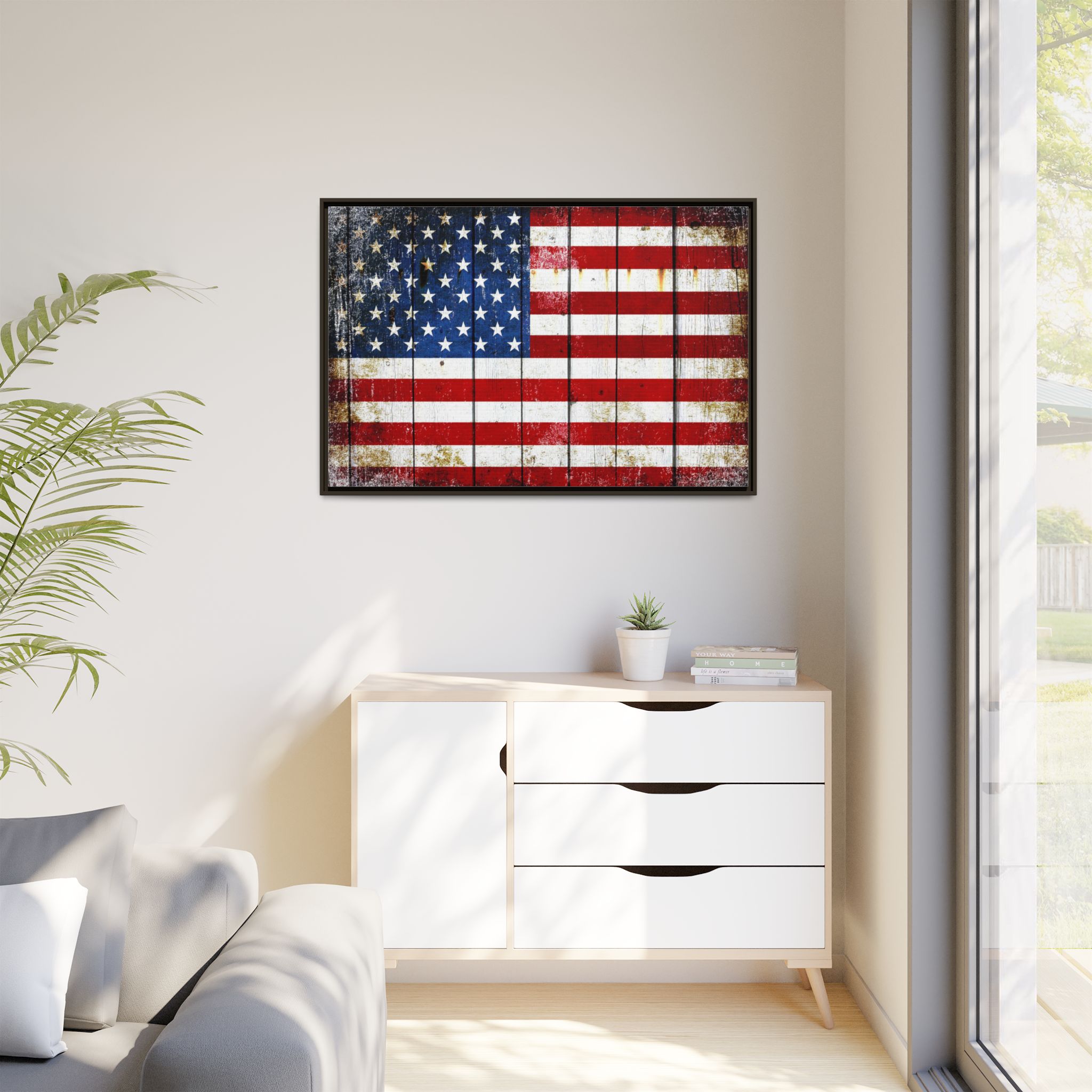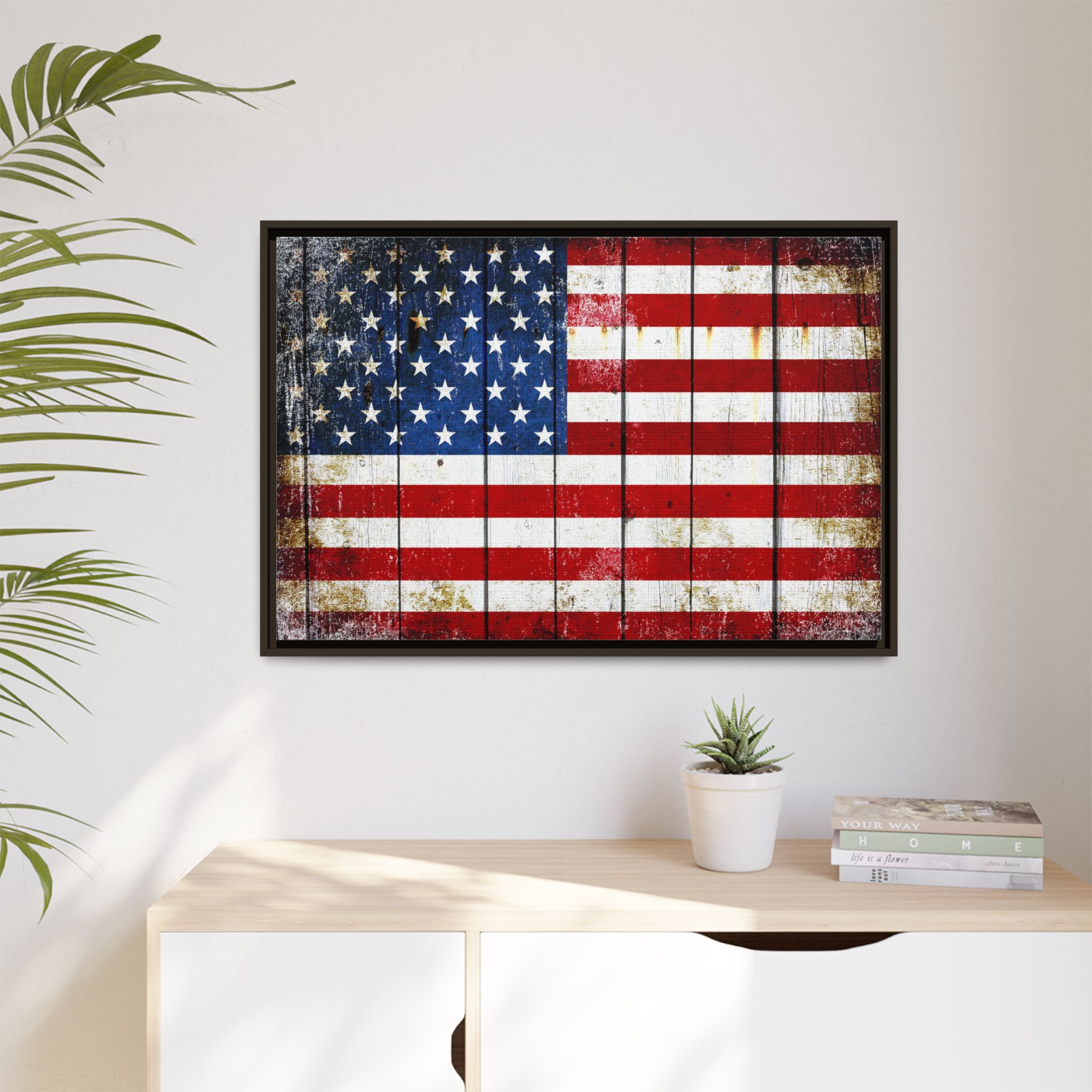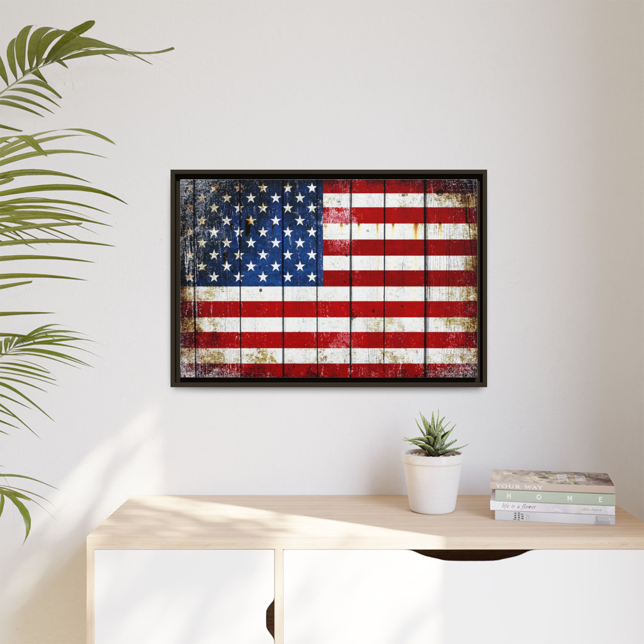 A tribute to enduring American spirit, this canvas print captures the rugged beauty of a distressed American flag painted onto weathered barn wood. Each detail, from the faded stars and stripes to the visible wood grain and imperfections, tells a story of heritage and resilience.