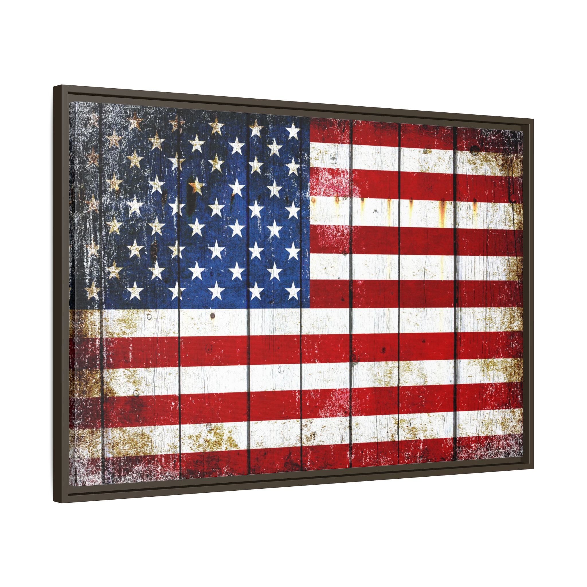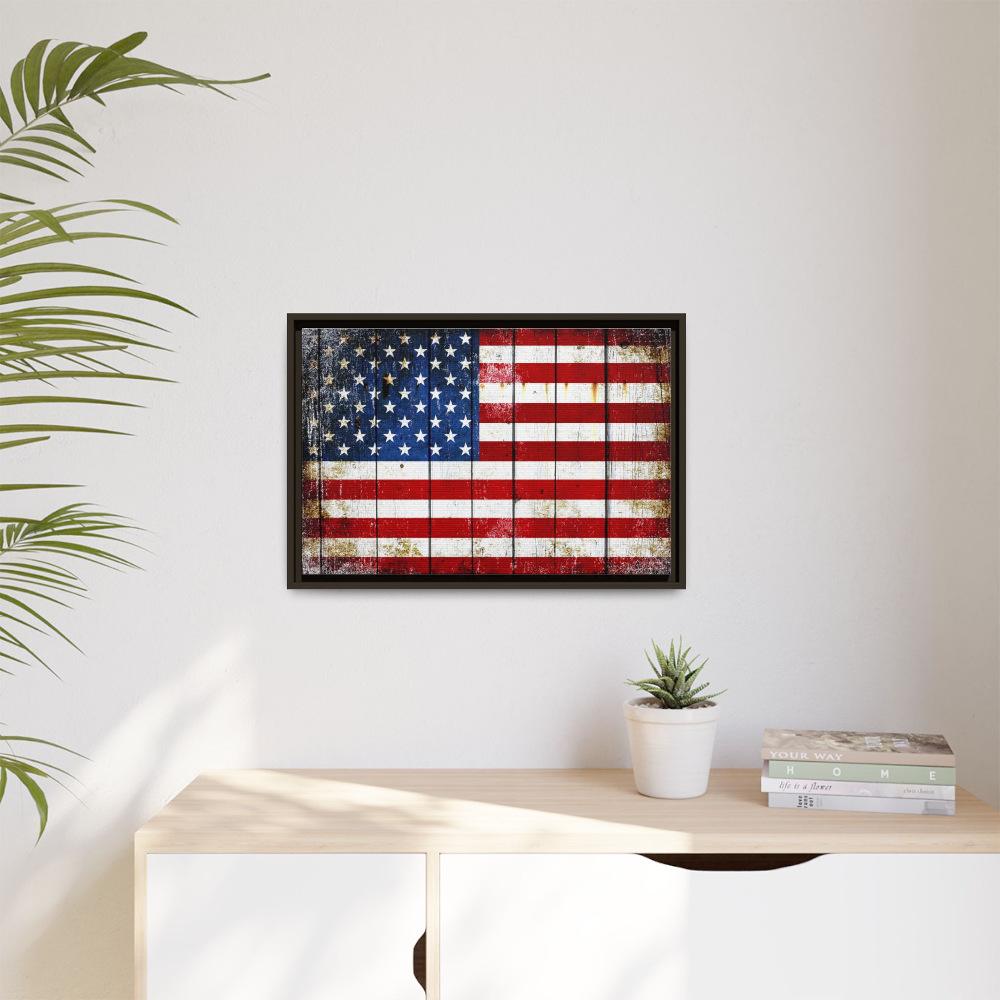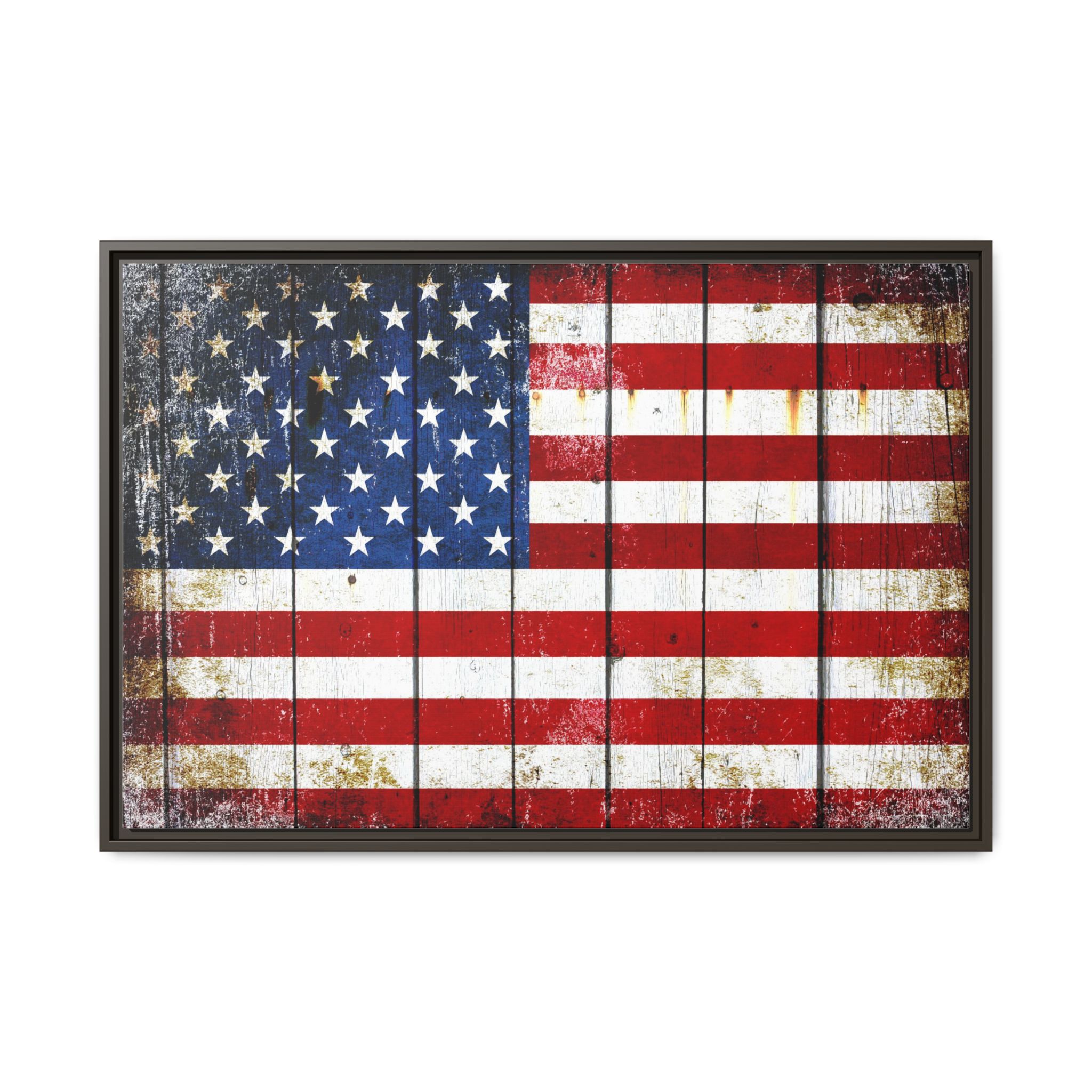 A tribute to enduring American spirit, this canvas print captures the rugged beauty of a distressed American flag painted onto weathered barn wood. Each detail, from the faded stars and stripes to the visible wood grain and imperfections, tells a story of heritage and resilience.