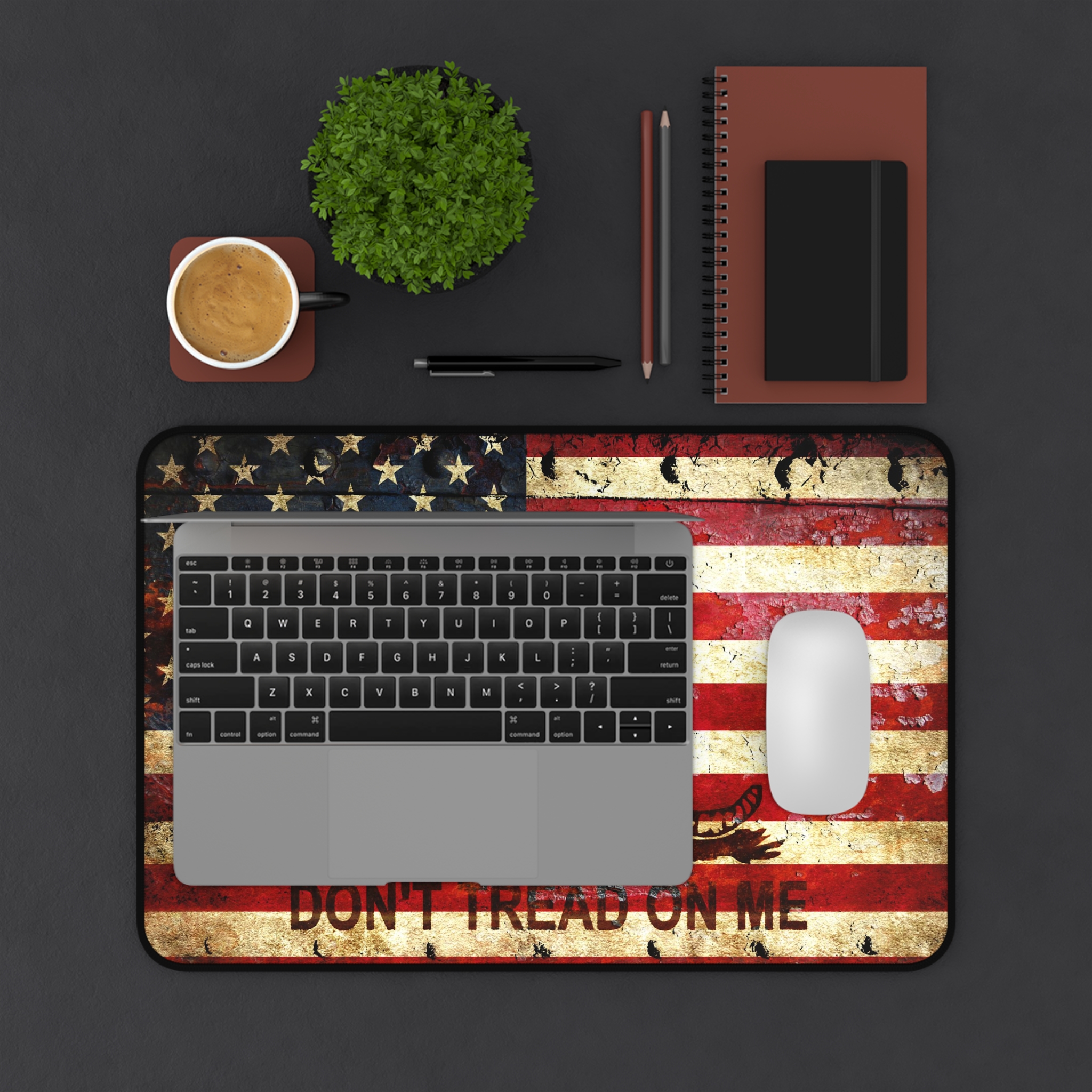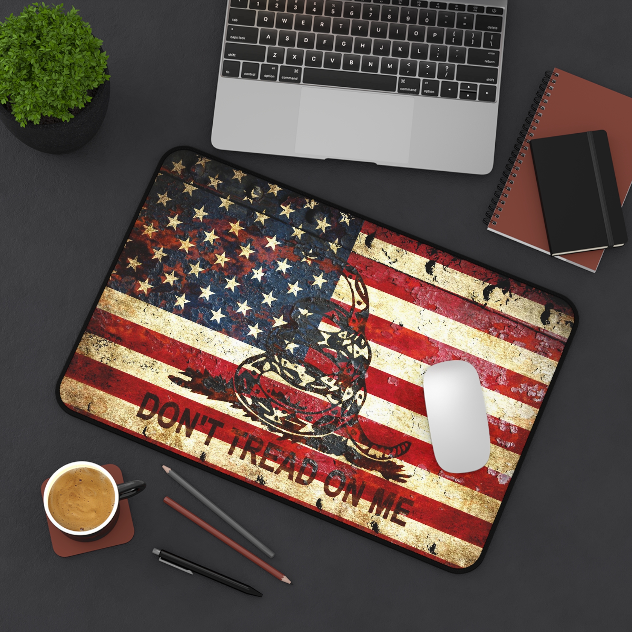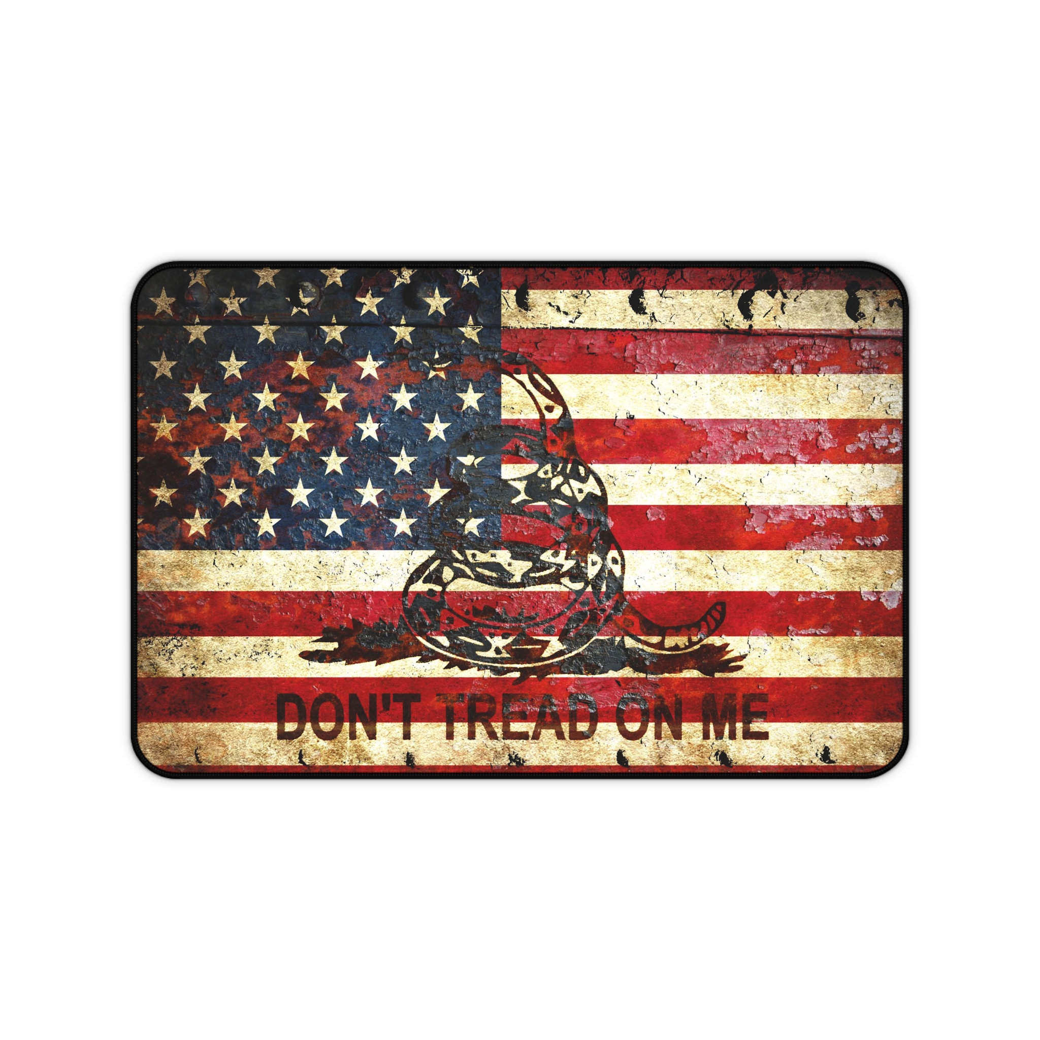 This multifunctional desk mat, features a rustic “Don’t Tread on Me” design with a combination of the American and Gadsden flags. Ideal for a home or work office, this 12″ x 18″ desk mat is made from durable 4mm thick neoprene, with an anti-slip backing and a hemmed edge for enhanced stability and durability.